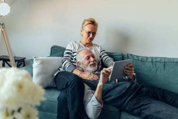 Cropped shot of an elderly man lying in his wife's lap , holding a tablet